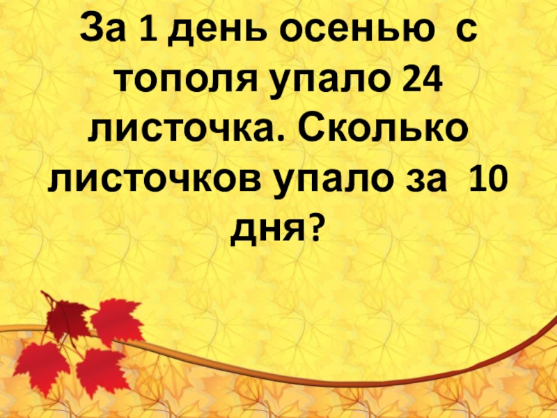 Слайд 23За 1 день осенью с тополя упало 24 листочка. Сколько листочков