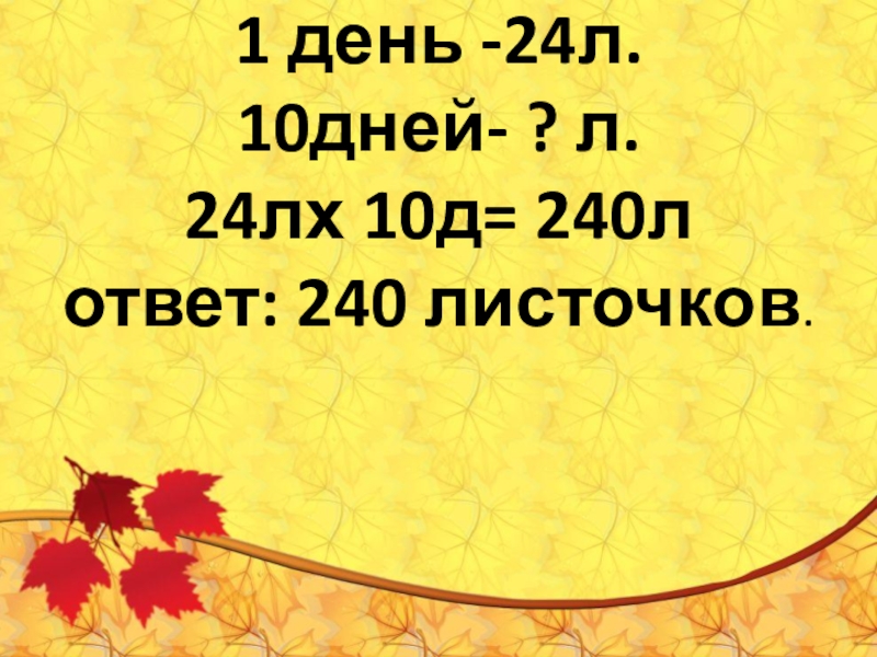 Слайд 241 день -24л. 10дней- ? л. 24лх 10д= 240л ответ: 240 листочков.