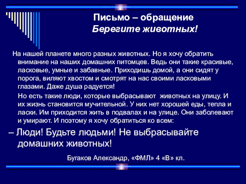 Но есть такие люди, которые выбрасывают животных на улицу. И их жизнь становится мучительной. У них нет хорошей еды, тепла и ласки. Им приходится жить в подвалах и на улице. Они заболевают и умирают. И поэтому я хочу обратиться ко всем: