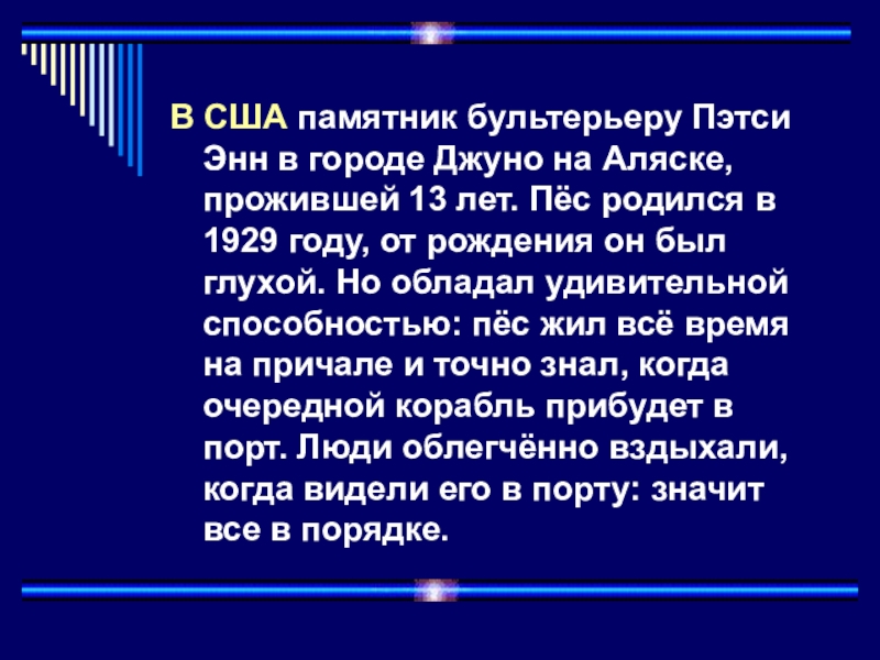 прожившей 13 лет. Пёс родился в 1929 году, от рождения он был глухой. Но обладал удивительной способностью: пёс жил всё время на причале и точно знал, когда очередной корабль прибудет в порт. Люди облегчённо вздыхали, когда видели его в порту: значит все в порядке.