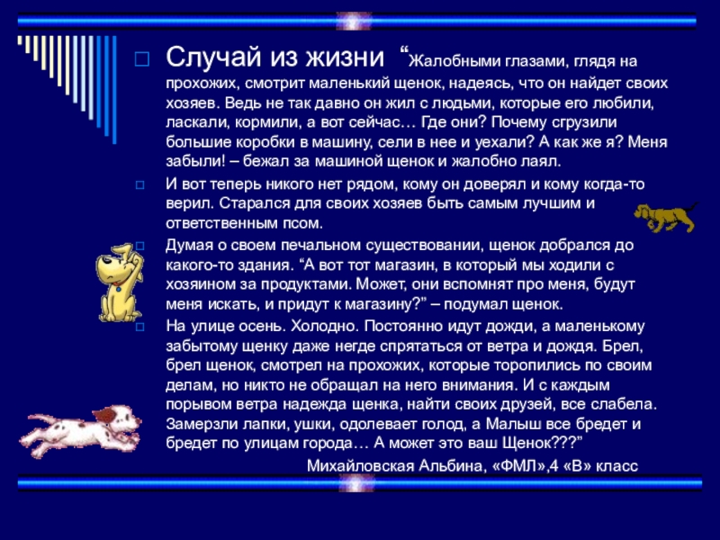 Слайд 28Случай из жизни “Жалобными глазами, глядя на прохожих, смотрит маленький щенок,