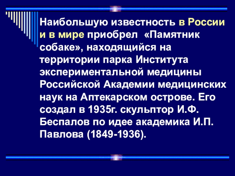 в России и в мире приобрел «Памятник собаке», находящийся на территории парка Института экспериментальной медицины Российской Академии медицинских наук на Аптекарском острове. Его создал в 1935г. скульптор И.Ф.Беспалов по идее академика И.П.Павлова (1849-1936).