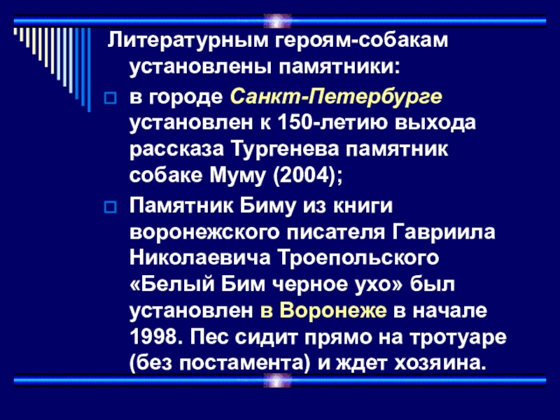Памятник Биму из книги воронежского писателя Гавриила Николаевича Троепольского «Белый Бим черное ухо» был установлен в Воронеже в начале 1998. Пес сидит прямо на тротуаре (без постамента) и ждет хозяина.