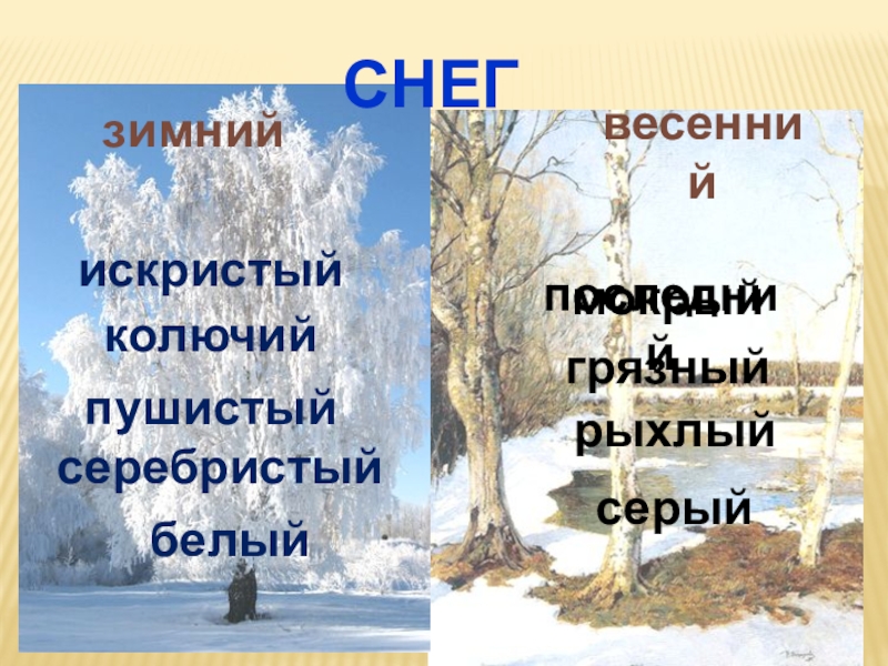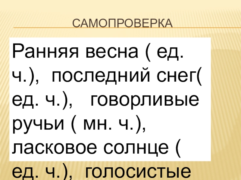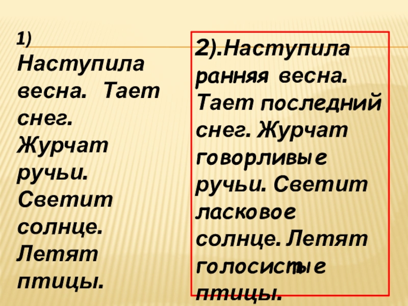2).Наступила ранняя весна. Тает последний снег. Журчат говорливые ручьи. Светит ласковое солнце. Летят голосистые птицы.