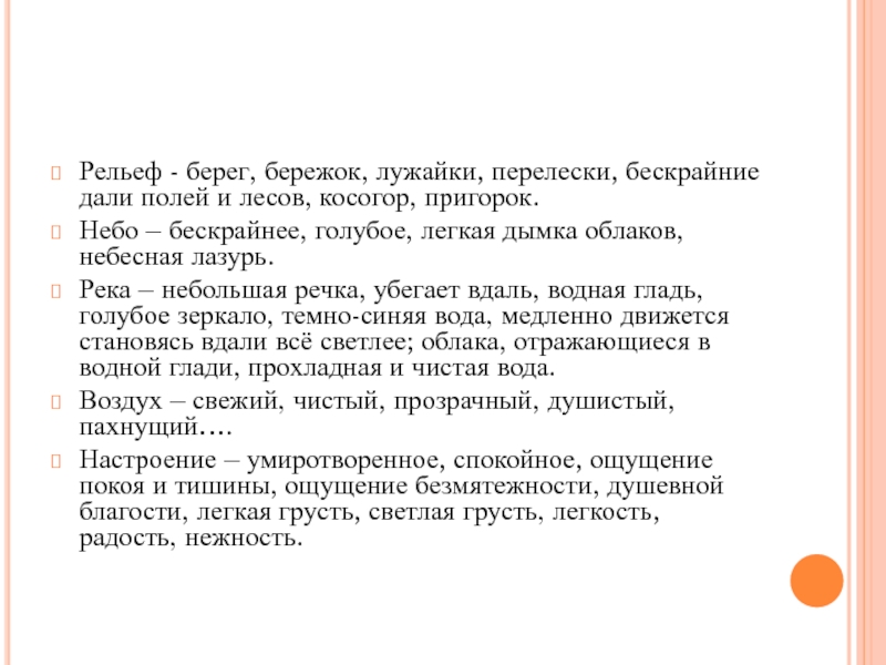 Слайд 12Рельеф - берег, бережок, лужайки, перелески, бескрайние дали полей и лесов,