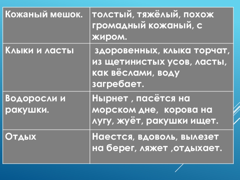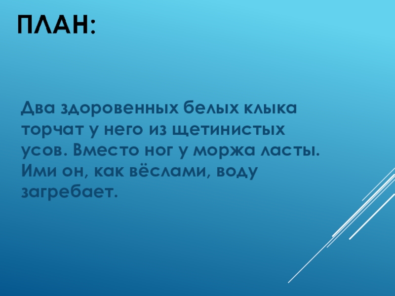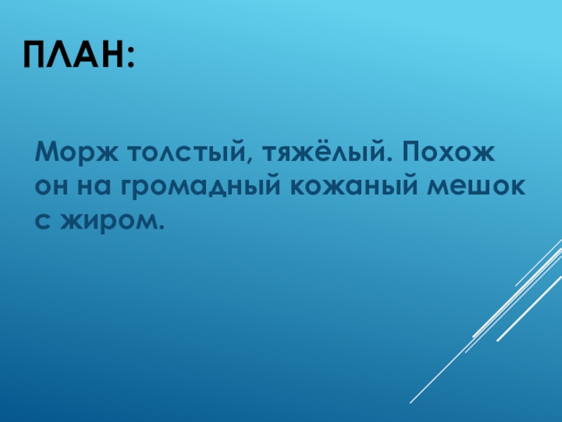 План:Морж толстый, тяжёлый. Похож он на громадный кожаный мешок с жиром.