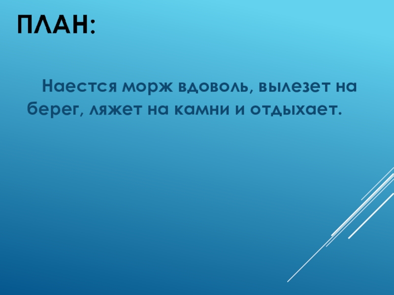 Слайд 9Наестся морж вдоволь, вылезет на берег, ляжет на камни и отдыхает.