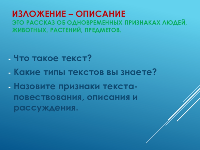 Изложение – описание это рассказ об одновременных признаках людей, животных, растений, предметов.Что такое текст?Какие типы текстов вы знаете?Назовите признаки текста-повествования, описания и рассуждения.