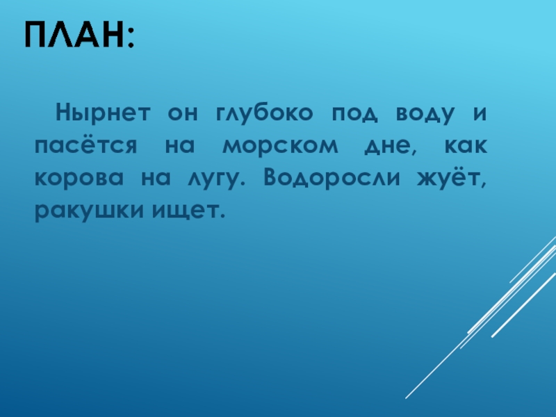 Слайд 8Нырнет он глубоко под воду и пасётся на морском дне, как