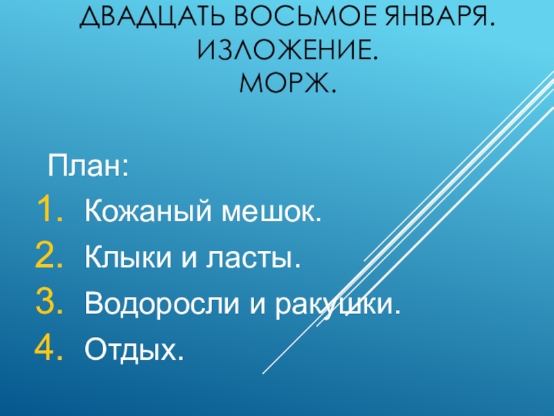 Двадцать восьмое января. Изложение. Морж. План:Кожаный мешок.Клыки и ласты.Водоросли и ракушки.Отдых.