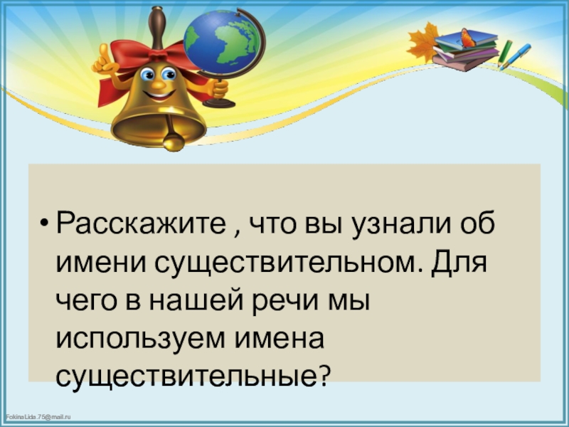 Расскажите , что вы узнали об имени существительном. Для чего в нашей речи мы используем имена существительные?