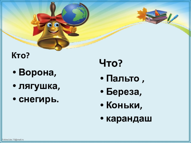 Кто?Ворона,лягушка,снегирь.Что?Пальто ,Береза, Коньки,карандаш