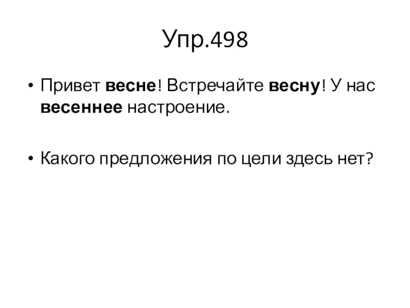 Упр.498Привет весне! Встречайте весну! У нас весеннее настроение.Какого предложения по цели здесь нет?