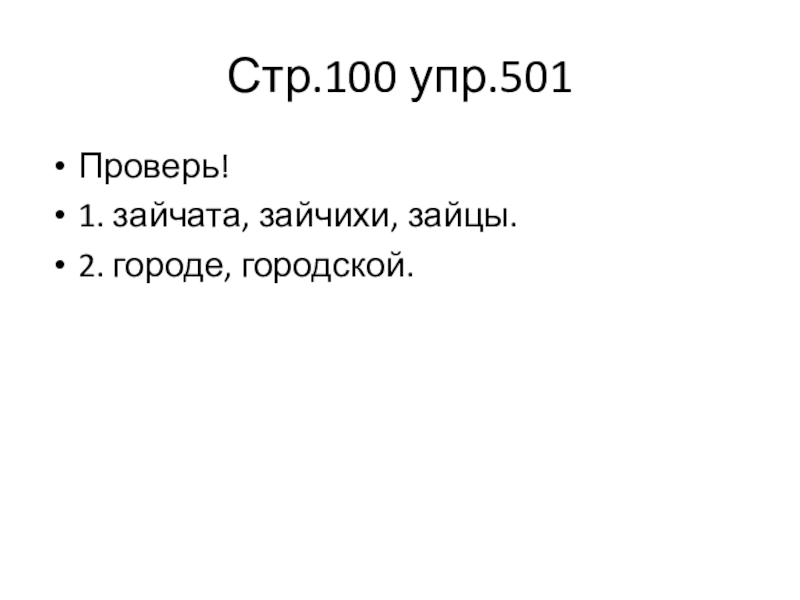 Стр.100 упр.501Проверь!1. зайчата, зайчихи, зайцы.2. городе, городской.