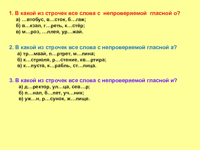 3. В какой из строчек все слова с непроверяемой гласной и?