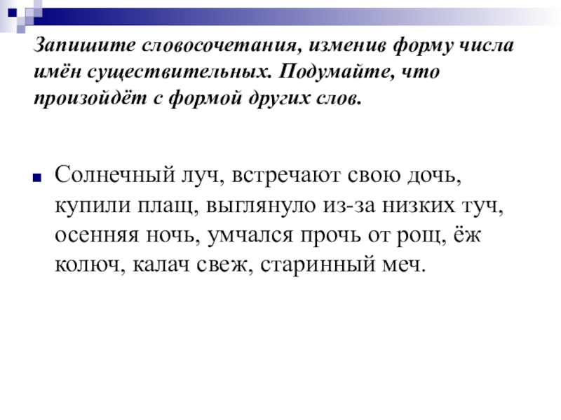 Солнечные лучи, встречают своих дочерей, купили плащи, выглянуло из-за низкой тучи, осенние ночи, умчался прочь от рощи, ежи колючи, калачи свежи, старинные мечи.