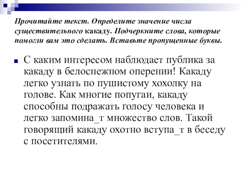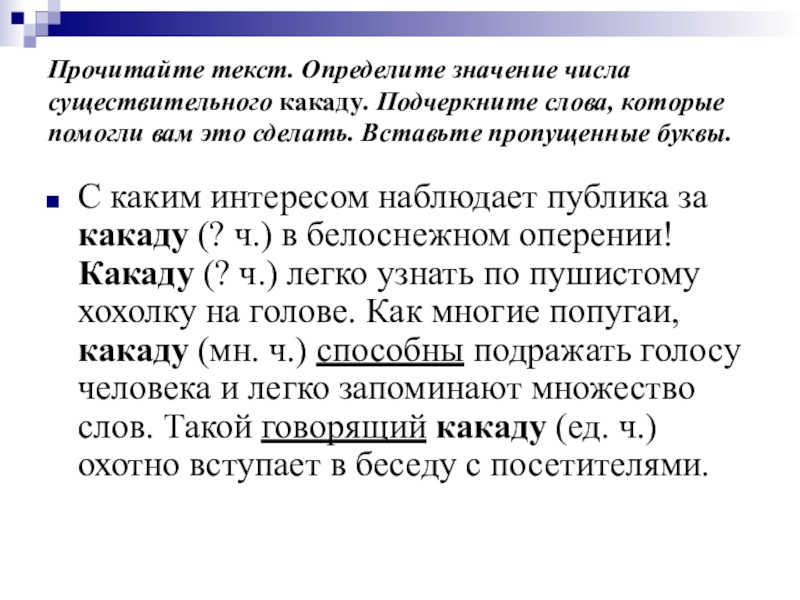С каким интересом наблюдает публика за какаду (? ч.) в белоснежном оперении! Какаду (? ч.) легко узнать по пушистому хохолку на голове. Как многие попугаи, какаду (мн. ч.) способны подражать голосу человека и легко запоминают множество слов. Такой говорящий какаду (ед. ч.) охотно вступает в беседу с посетителями.
