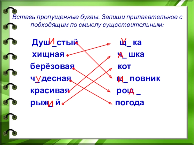 Вставь пропущенные буквы. Запиши прилагательное с подходящим по смыслу существительным: