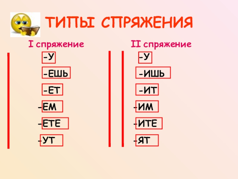 I спряжениеII спряжениеТИПЫ СПРЯЖЕНИЯ-У-ЕШЬ-ЕТЕМЕТЕУТ-У-ИШЬ-ИТИМИТЕЯТ