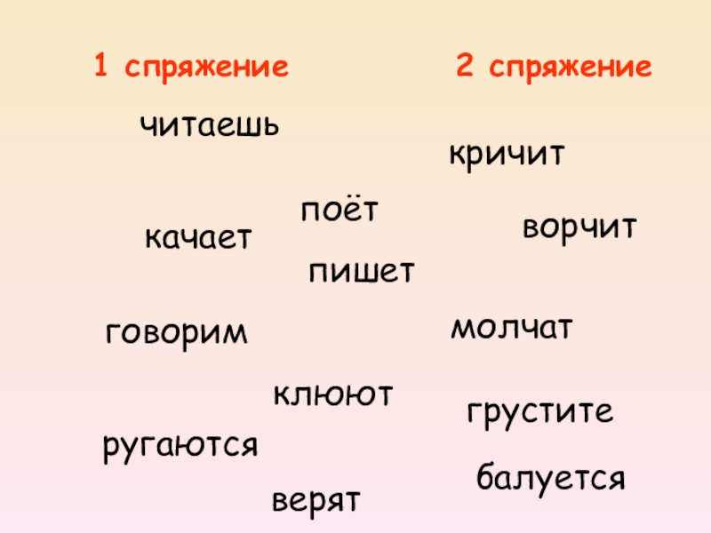 1 спряжение2 спряжениекачаетпишетклюютругаютсякричитмолчатчитаешьворчитбалуетсяговоримпоётгруститеверят