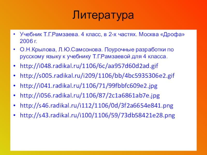 ЛитератураУчебник Т.Г.Рамзаева. 4 класс, в 2-х частях. Москва «Дрофа» 2006 г.О.Н.Крылова, Л.Ю.Самсонова. Поурочные разработки по русскому языку