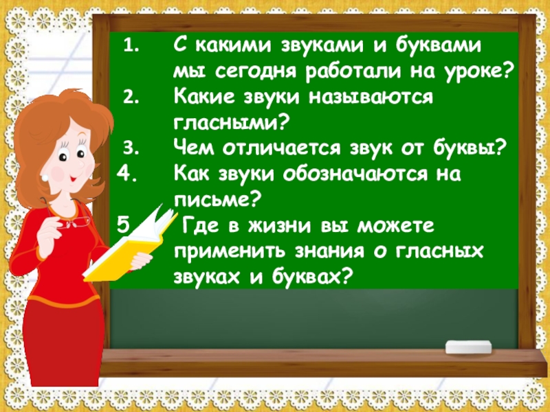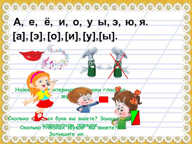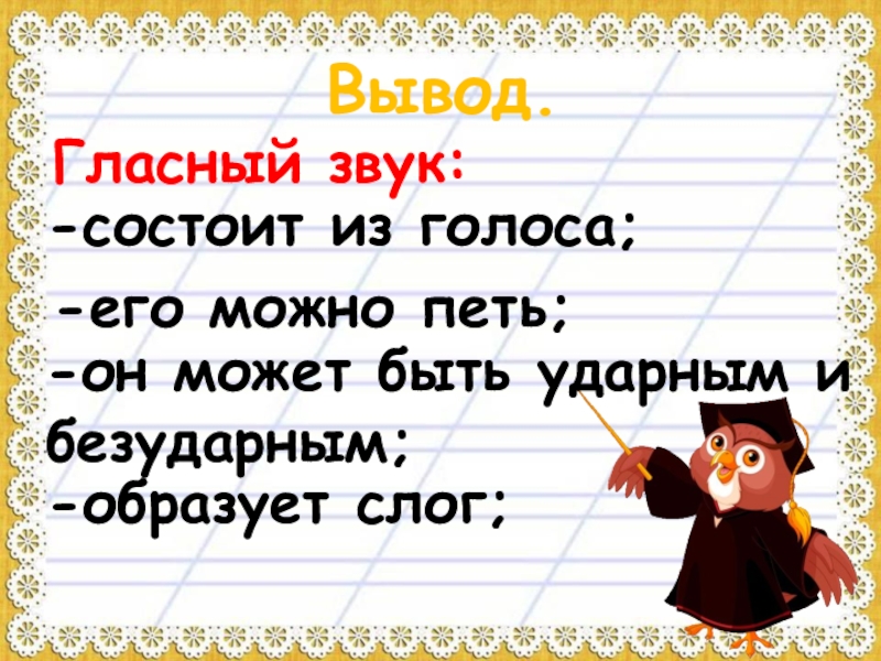 Назовите характерные признаки гласных звуков.