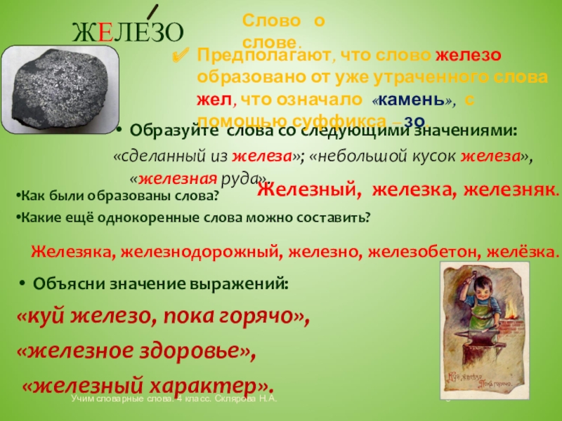 Предполагают, что слово железо образовано от уже утраченного слова жел, что означало «камень», с помощью суффикса – зо.