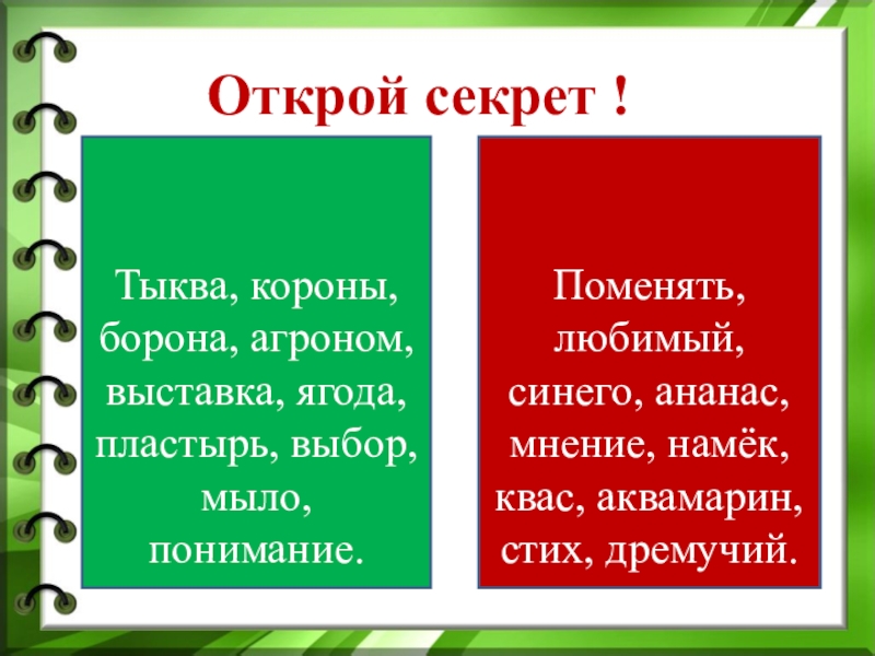 Поменять, любимый, синего, ананас, мнение, намёк, квас, аквамарин, стих, дремучий.