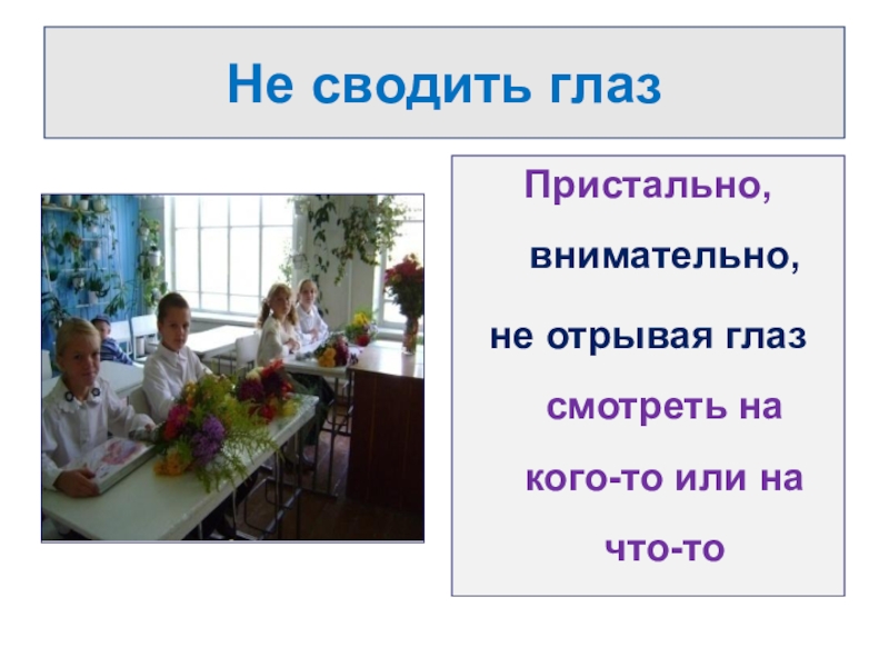 Не сводить глазПристально, внимательно, не отрывая глаз смотреть на кого-то или на что-то