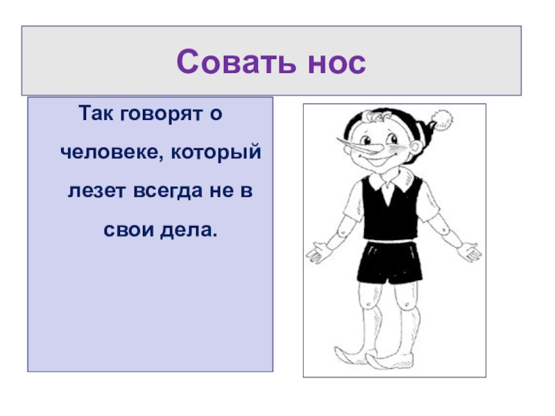 Совать носТак говорят о человеке, который лезет всегда не в свои дела.