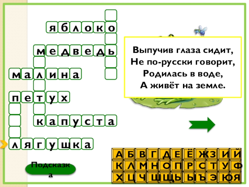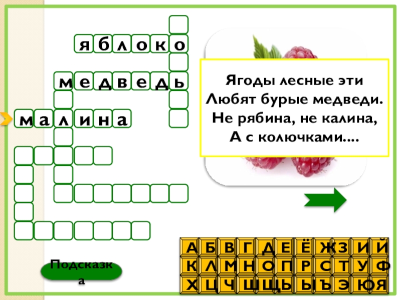 коолябдевемдьмааилнЦЧХЯЮЭЪЫЬЩШЛМКФУТСРПОНБВАЙИЗЖЕДГЁПодсказкаЯгоды лесные эти Любят бурые медведи. Не рябина, не калина, А с колючками....