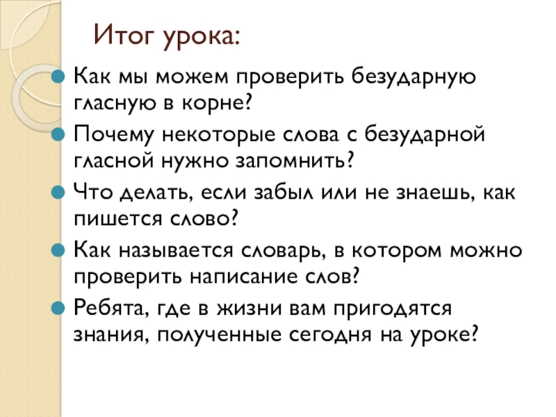 Итог урока: Как мы можем проверить безударную гласную в корне?Почему некоторые слова с безударной гласной нужно запомнить? Что