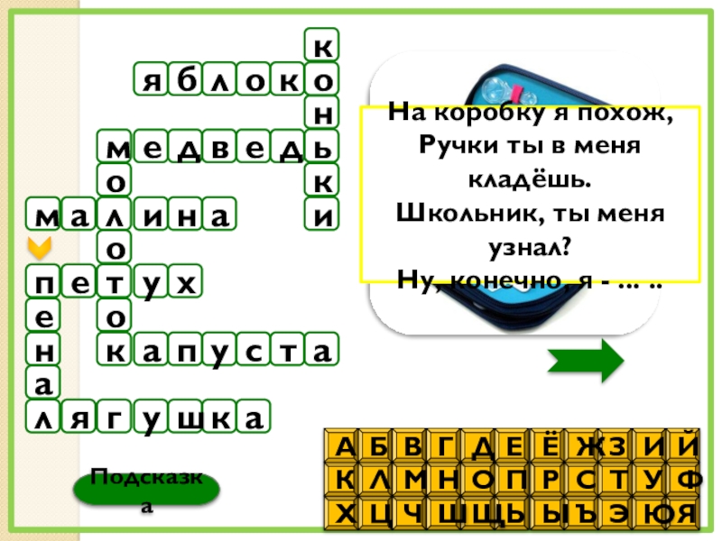 ккоолябндевемдькомаиаилнопеутхеонтасуакпаляакугшЦЧХЯЮЭЪЫЬЩШЛМКФУТСРПОНБВАЙИЗЖЕДГЁПодсказкаНа коробку я похож, Ручки ты в меня кладёшь. Школьник, ты меня узнал? Ну, конечно, я -