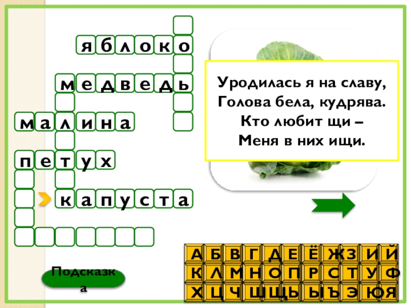 коолябдевемдьмааилнпеутхтасуакпЦЧХЯЮЭЪЫЬЩШЛМКФУТСРПОНБВАЙИЗЖЕДГЁПодсказкаУродилась я на славу,Голова бела, кудрява.Кто любит щи – Меня в них ищи.