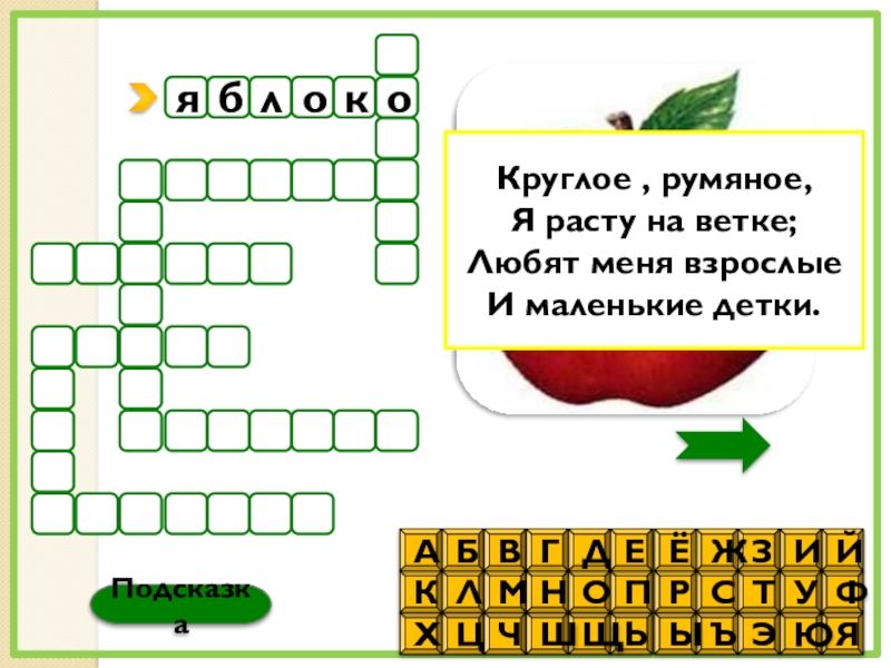 коолябЦЧХЯЮЭЪЫЬЩШЛМКФУТСРПОНБВАЙИЗЖЁЕДГПодсказкаКруглое , румяное,Я расту на ветке;Любят меня взрослые И маленькие детки.