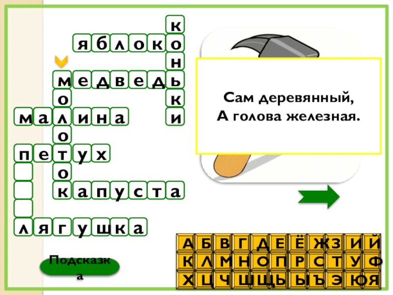ккоолябндевемдькомаиаилнопеутхотасуакпляакугшЦЧХЯЮЭЪЫЬЩШЛМКФУТСРПОНБВАЙИЗЖЕДГЁПодсказкаСам деревянный,А голова железная.