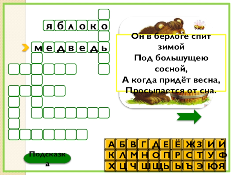 коолябдевемдьЦЧХЯЮЭЪЫЬЩШЛМКФУТСРПОНБВАЙИЗЖЕДГЁПодсказкаОн в берлоге спит зимойПод большущею сосной,А когда придёт весна,Просыпается от сна.