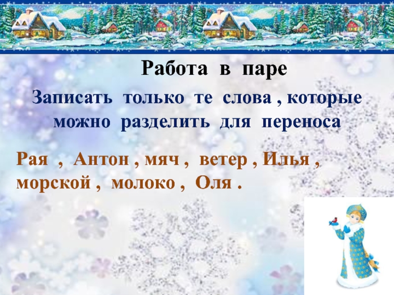 Рая , Антон , мяч , ветер , Илья , морской , молоко , Оля .