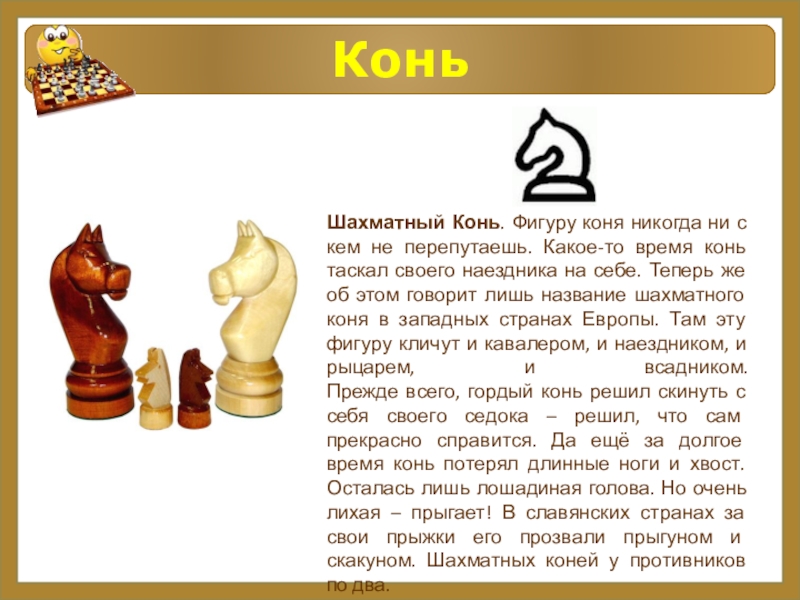 Прежде всего, гордый конь решил скинуть с себя своего седока – решил, что сам прекрасно справится. Да ещё за долгое время конь потерял длинные ноги и хвост. Осталась лишь лошадиная голова. Но очень лихая – прыгает! В славянских странах за свои прыжки его прозвали прыгуном и скакуном. Шахматных коней у противников по два.