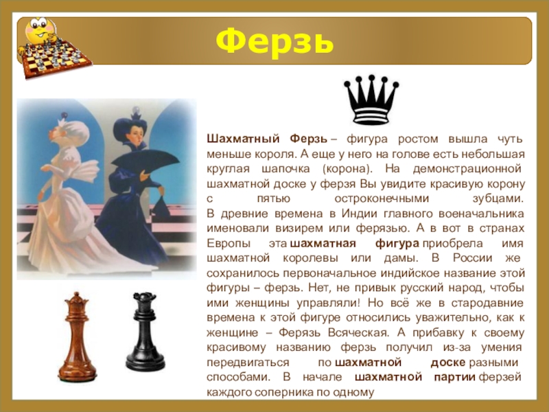 В древние времена в Индии главного военачальника именовали визирем или ферязью. А в вот в странах Европы эта шахматная фигура приобрела имя шахматной королевы или дамы. В России же сохранилось первоначальное индийское название этой фигуры – ферзь. Нет, не привык русский народ, чтобы ими женщины управляли! Но всё же в стародавние времена к этой фигуре относились уважительно, как к женщине – Ферязь Всяческая. А прибавку к своему красивому названию ферзь получил из-за умения передвигаться по шахматной доске разными способами. В начале шахматной партии ферзей каждого соперника по одному.