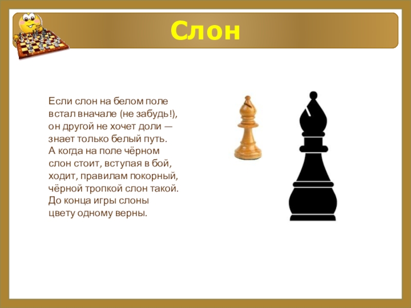 шахматный слон был слоном – это подтверждают старинные шахматные наборы в Эрмитаже. Но в нашей холодной стране ведь слоны не везде водятся, да и, если упадёт шахматный слон со стола, то хобот и хвост могут отвалиться, больно хрупкая фигура. Поэтому со временем на шахматной доске и появилась фигура, похожая на человечка, который и управлял этим могучим животным. Кстати, слоны перевелись не только в России. Как только не называют эту фигуру в других странах: и офицером, и стрелком, и гонцом, и епископом, и даже... шутом! Слонов в каждой армии по два.