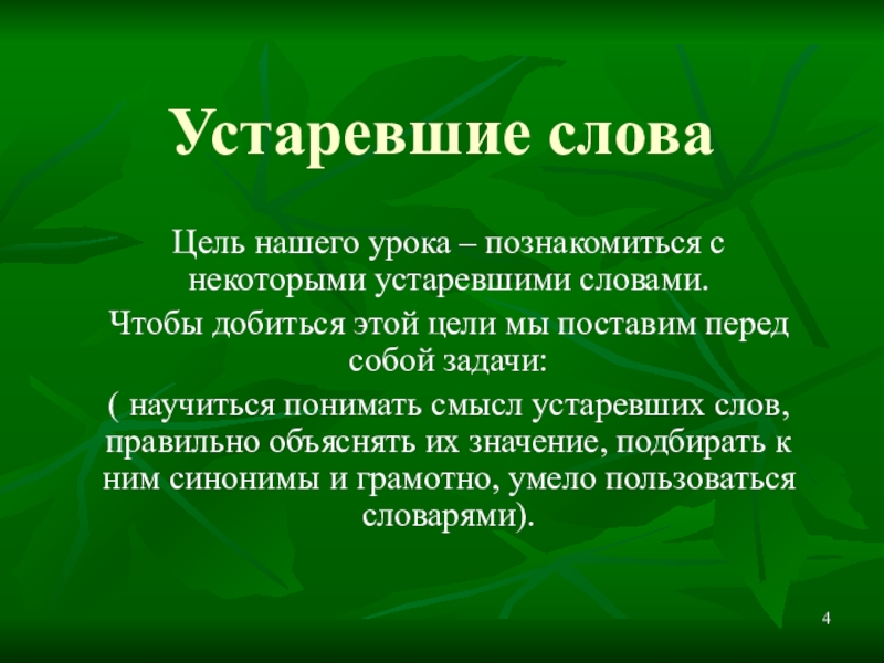 ( научиться понимать смысл устаревших слов, правильно объяснять их значение, подбирать к ним синонимы и грамотно, умело пользоваться словарями).