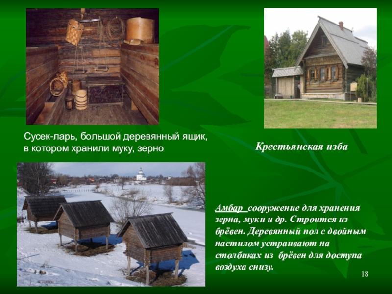 для хранения зерна, муки и др. Строится из брёвен. Деревянный пол с двойным настилом устраивают на столбиках из брёвен для доступа воздуха снизу.