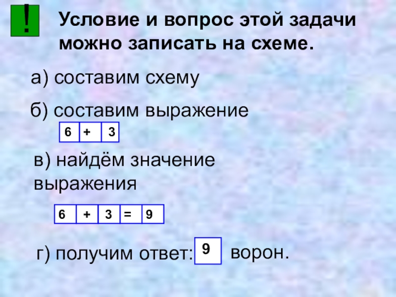 !Условие и вопрос этой задачи можно записать на схеме. а) составим схемуб) составим выражение6+3в) найдём значение выражения6+3=9г)