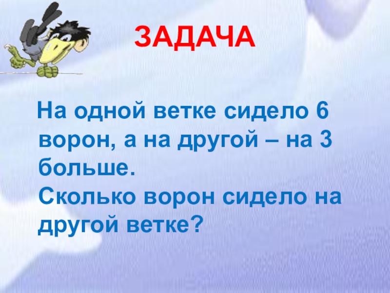 УСЛОВИЕ   На одной ветке сидело 6 ворон, а на другой – на 3 больше