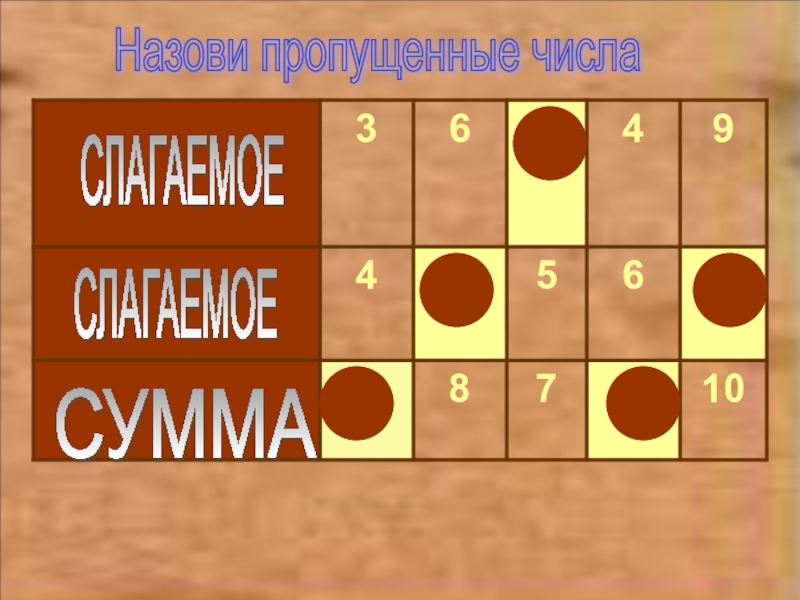 Назови пропущенные числа СЛАГАЕМОЕ СЛАГАЕМОЕ СУММА