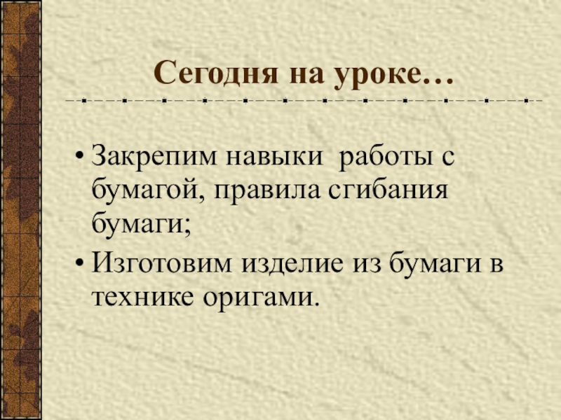 Сегодня на уроке…Закрепим навыки работы с бумагой, правила сгибания бумаги;Изготовим изделие из бумаги в технике оригами.