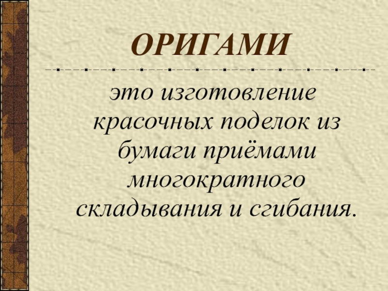 ОРИГАМИ это изготовление красочных поделок из бумаги приёмами многократного складывания и сгибания.