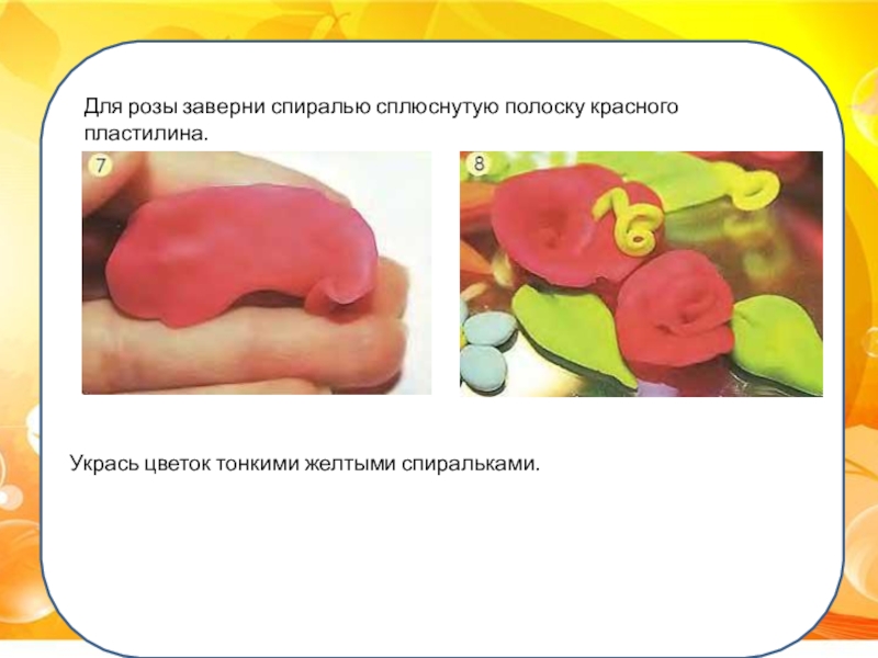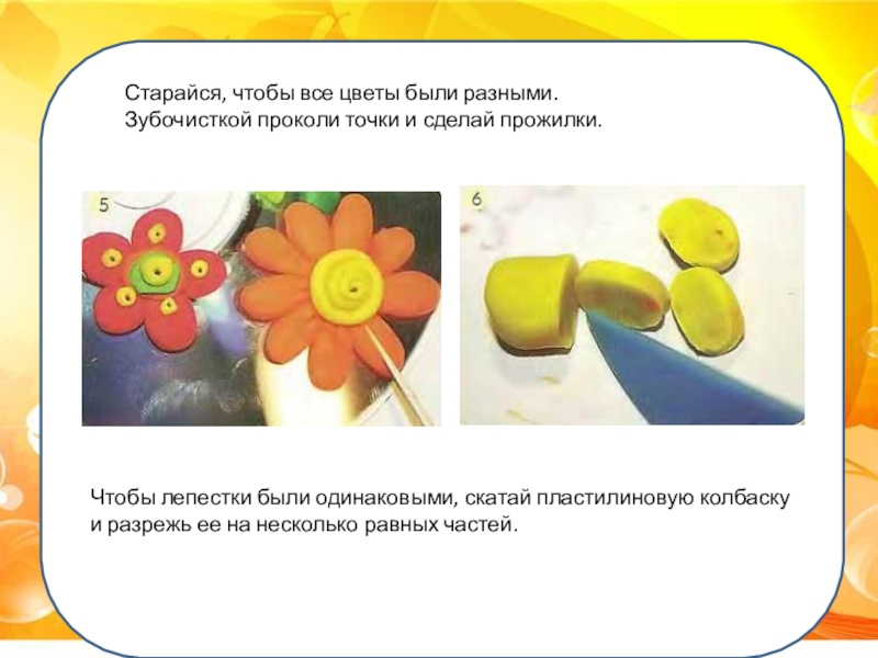 Чтобы лепестки были одинаковыми, скатай пластилиновую колбаску и разрежь ее на несколько равных частей.