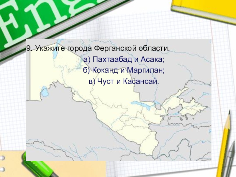 9. Укажите города Ферганской области.	а) Пахтаабад и Асака;	б) Коканд и Маргилан;	в) Чуст и Касансай.